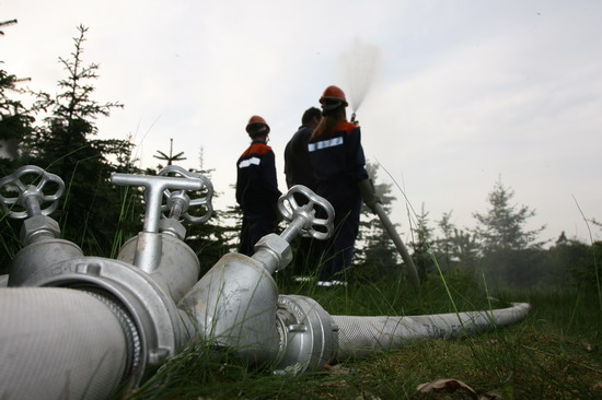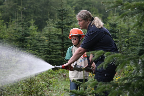 Feuerwehrleuten hat der Einsatz im Wald sichtlich Freude bereitet.