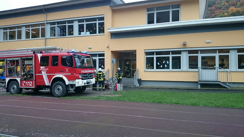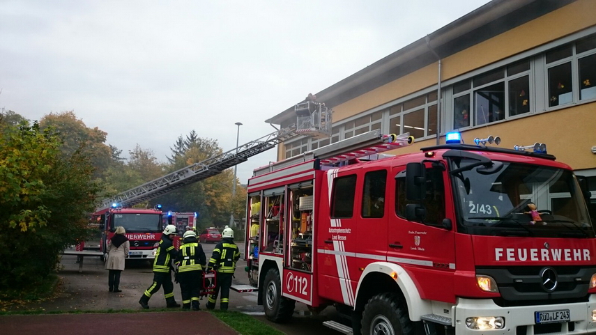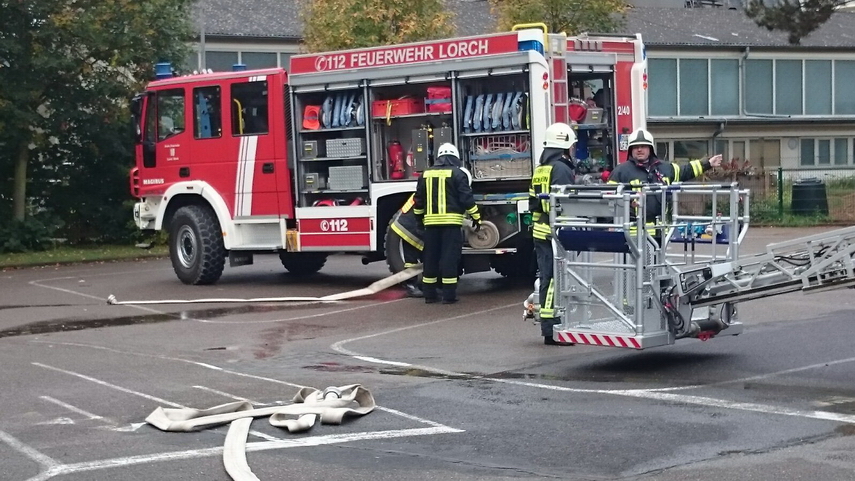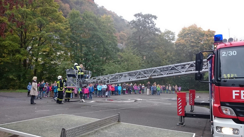 Einsatz der neuen Drehleiter in der Lorcher Grundschule, an der 125