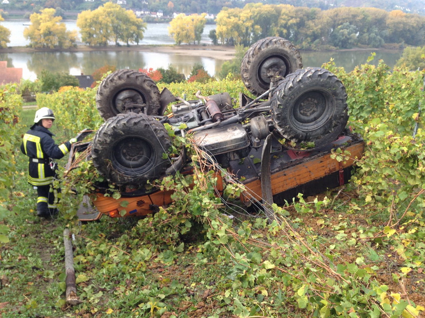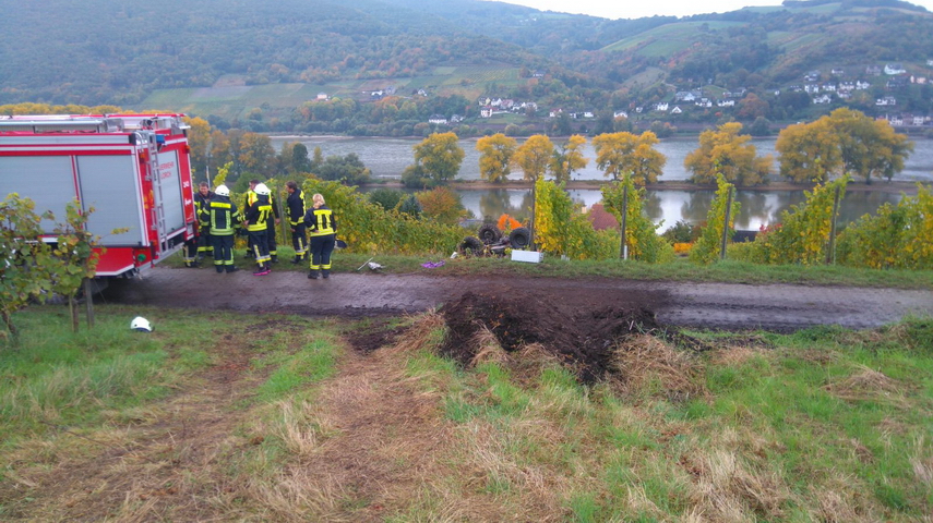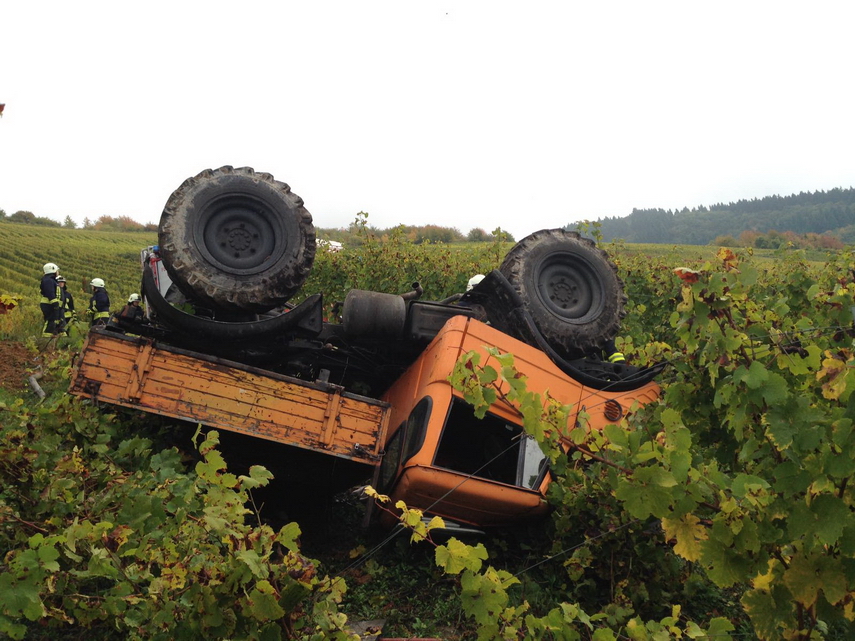 (HZ) Die Feuerwehr Lorch wurde heute zu einem umgestürzten Traktor in den Weinbergen alarmiert. Ein Unimog eines Winzers war in den Weinbergen abgerutscht, über ein Brachfeld in einen Weinberg gefallen. Verletzt wurde zum Glück keiner. Da zum aufrichten des Unimogs ein Kran benötigt wurde ist eine Fachfirma informiert worden. Die Feuerwehr nahm auslaufende Betriebsstoffe auf und sicherte das Fahrzeug gegen weiteres Abrutschen.