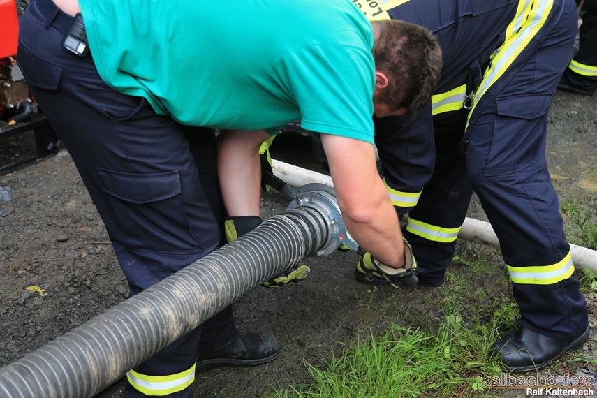 Mit z.T. 5 Tragkraftspritzen gleichzeitig wurde pro Minute Ca. 3500 Liter an der Grube vorbei geleitet und so eine Überflutung verhindert.