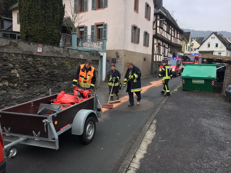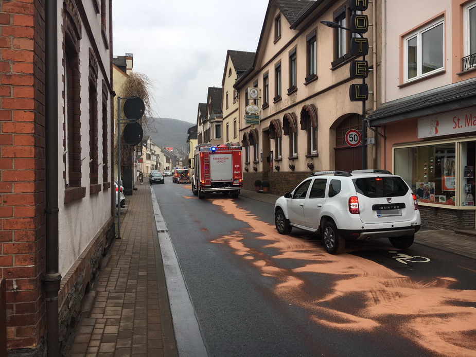 (HZ) Die Feuerwehr Lorch wurde am Samstag Vormittag zu einer Öl Spur alarmiert. Bei der Anfahrt zum Gerätehaus sah der Stadtbrandinspektor bereits das die Kräfte Lorch nicht reichen werden und ließ über die Leitstelle Bad Schwalbach die Ortsteilwehr  Lorchhausen dazu alarmieren. Die Öl Spur zog sich über ca. 4,5 Kilometer durch das gesamte Ortsgebiet. Auch wurde die Kehrmaschiene vom Bauhof Oestrich-Winkel angefordert um das Kontaminierte Bindemittel aufzunehmen. Verursacher war vermutlich eine geplatzte Lenkgetriebe Leitung