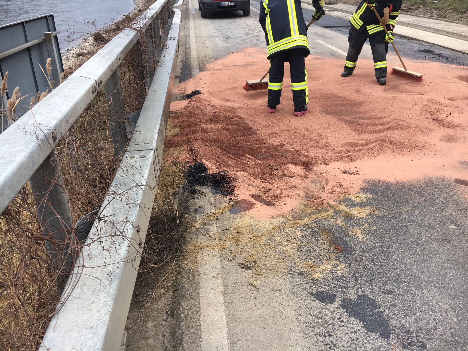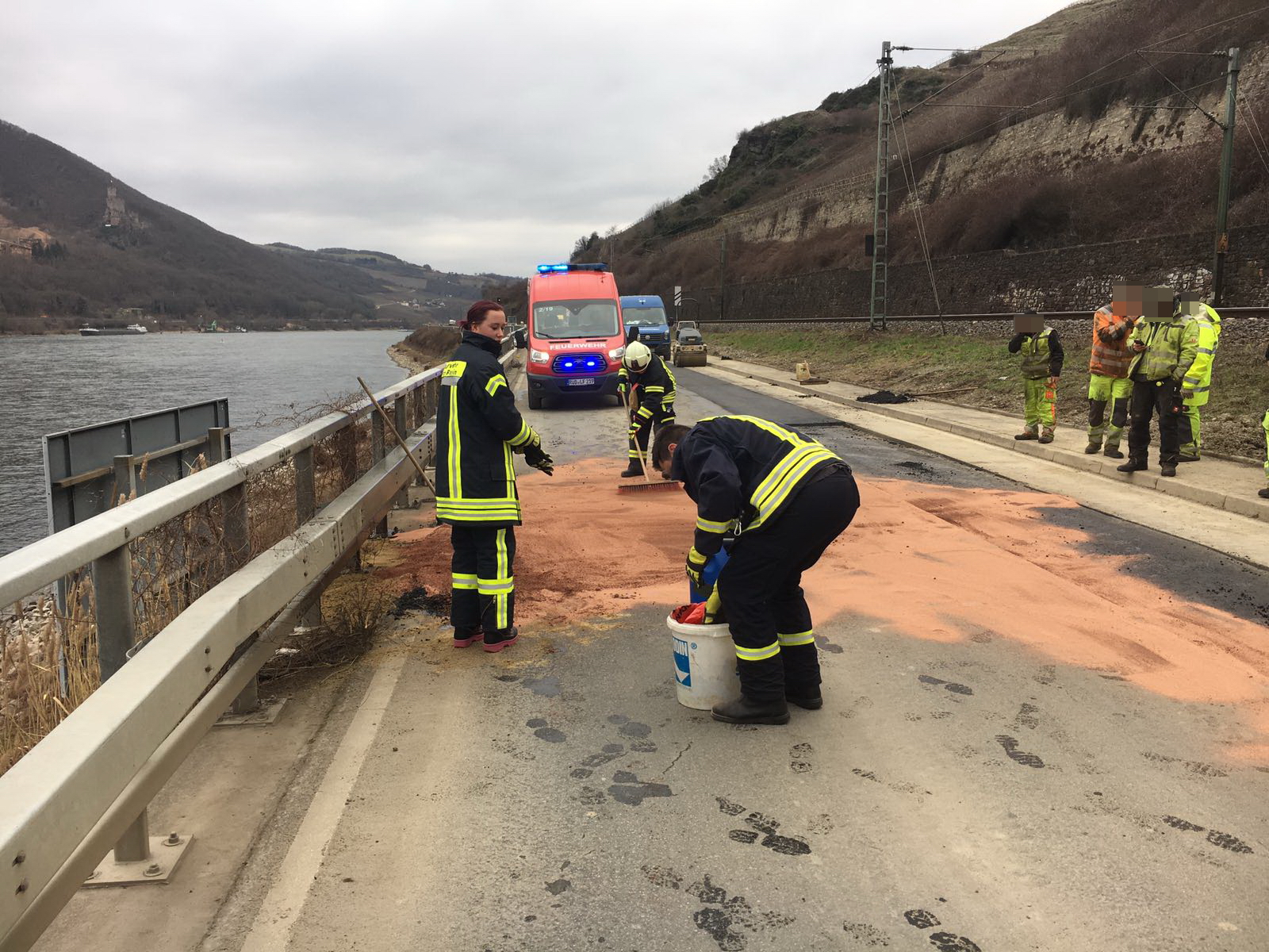 (HZ) Die Feuerwehren Lorch und Lorchhausen wurden heute Mittag zu einer Ölspur im Bereich der Baustelle auf der B42 alarmiert. Bei einem Baustellenfahrzeug war eine Hydraulikleitung geplatzt und das Öl drohte über die Fahrbahn in den Rhein zu laufen. Beim Eintreffen hatten die Mitarbeiter der Baufirma schon einen Wall aus Sand und Teer angebracht um das ausbreiten zu verhindern. Die Feuerwehr streute die Ölspur ab und übergab die Einsatzstelle an den Bauleiter.