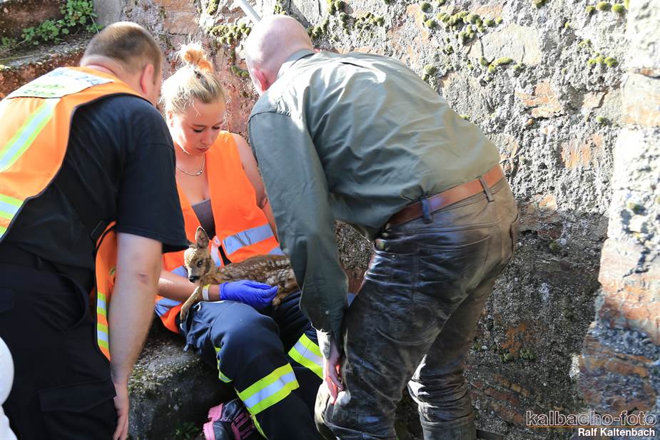 Ein Reh war aus 3 Meter Höhe in einen Flutgraben gestürzt.