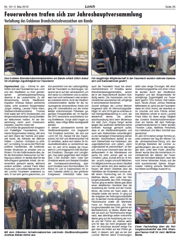 Gemeinsame Jahreshauptversammlung der Freiwilligen Feuerwehren der Stadt Lorch am Rhein in der Gaststätte "Laukenmühle" am 26.04.2019