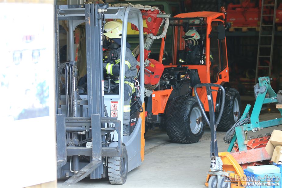 zu einem brennenden Traktor in einer Maschinenhalle alarmiert.