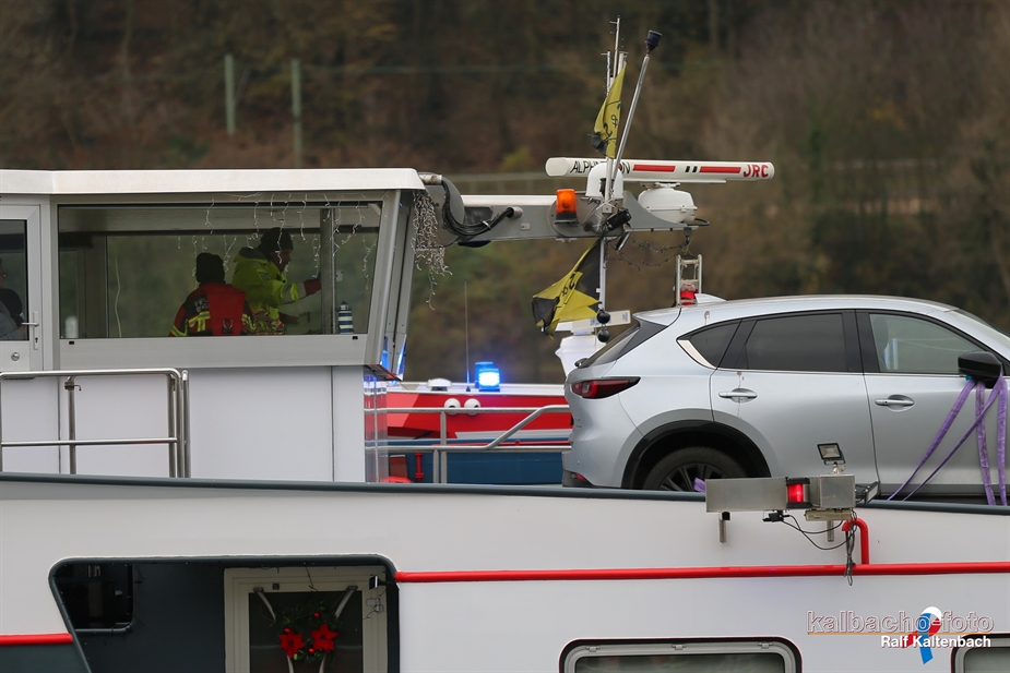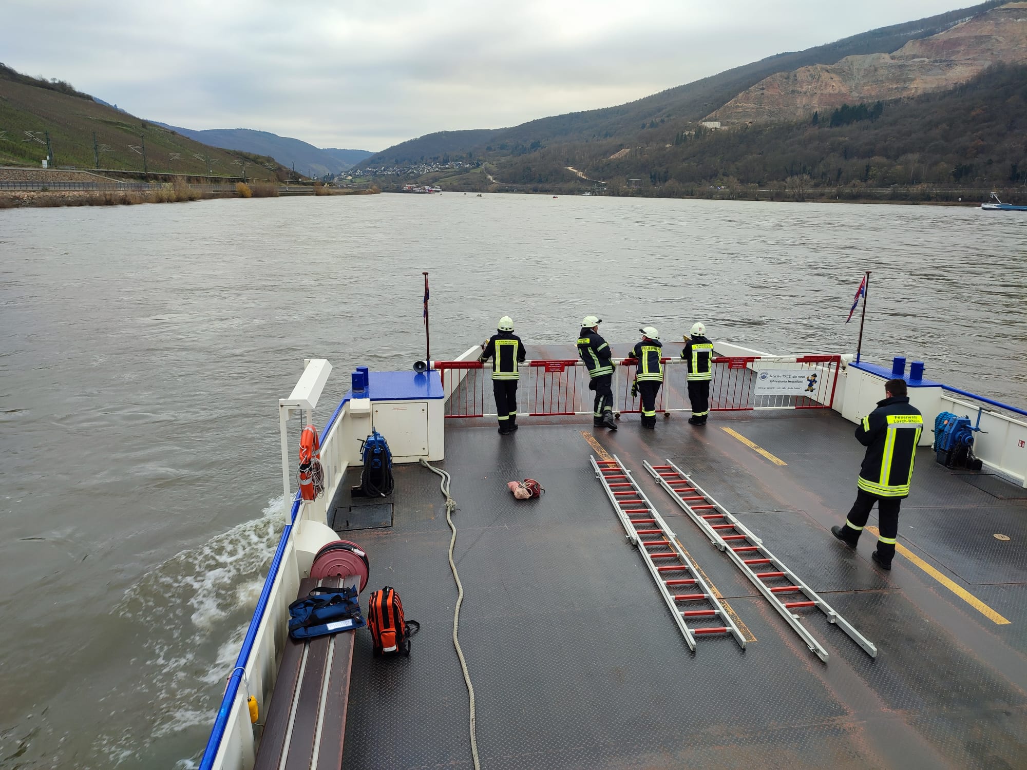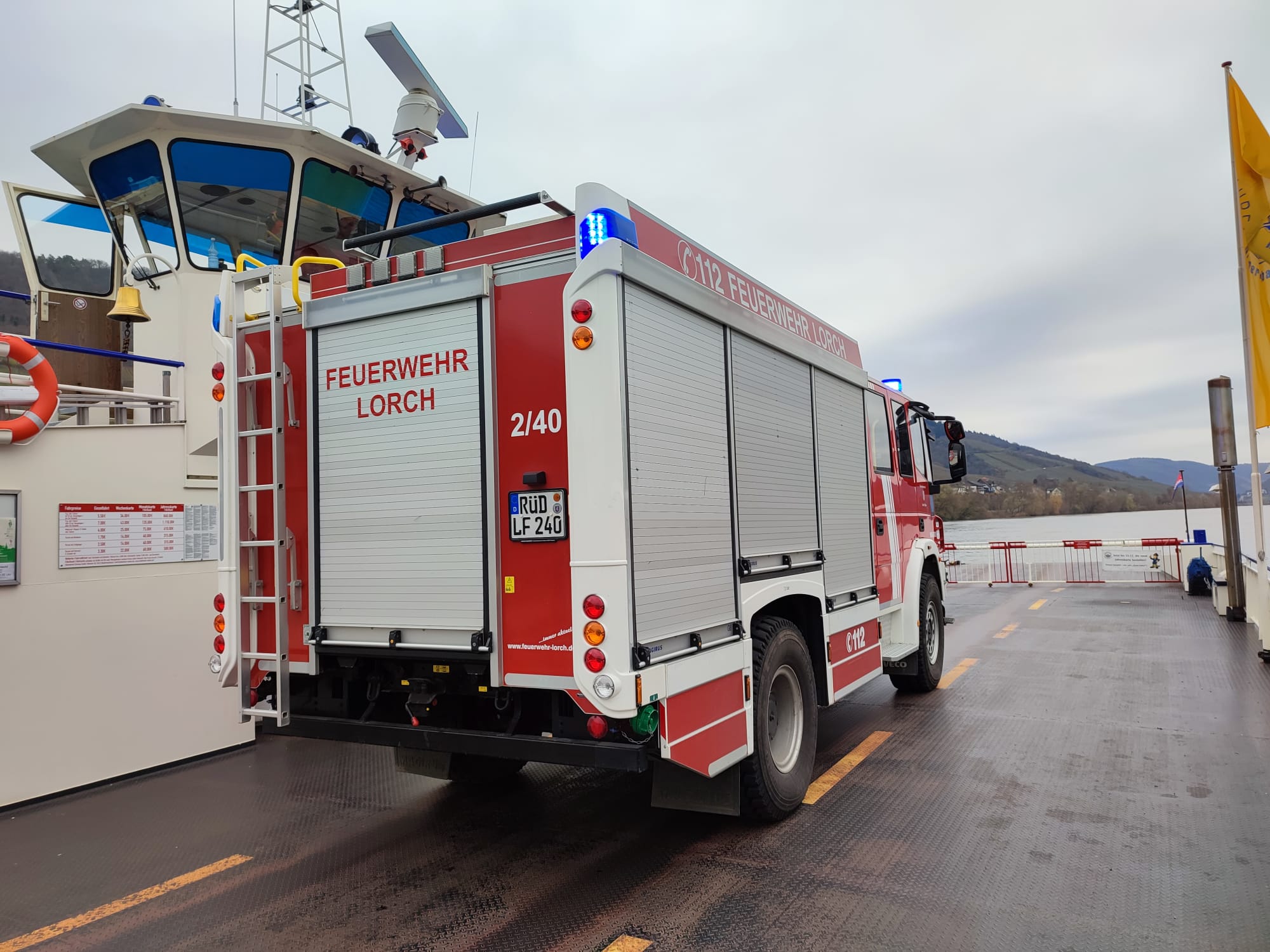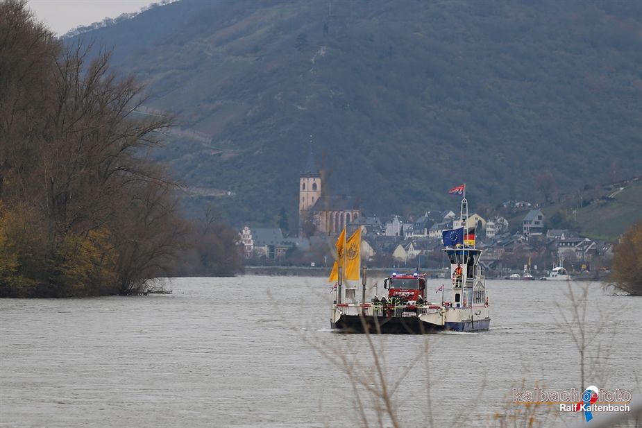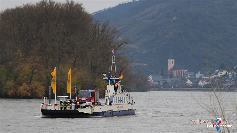 der Feuerwehr wurden auf die Autofähre in Lorch geladen, um von dort