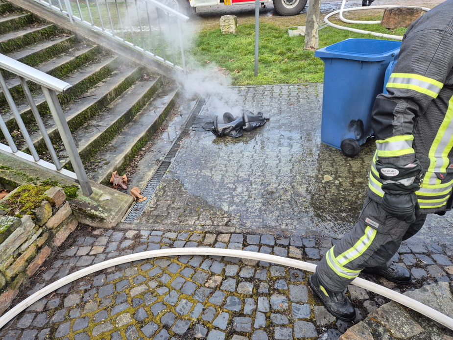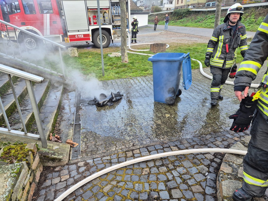 einer brennenden Mülltonne an einem Gebäude alarmiert.