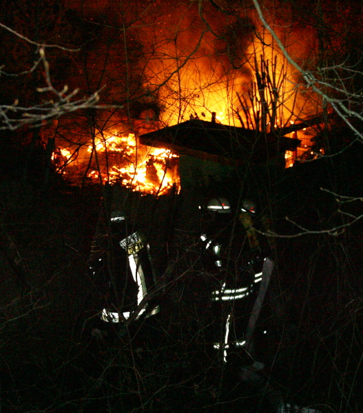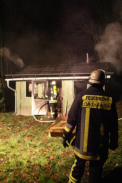 die Hütte in voller Ausdehnung. Daraufhin wurde die Feuerwehr Rüdesheim und Lorchhausen nachgefordert. Bei weiterem Erkunden der Einsatzstelle wurde bemerkt das auch eine zweite Hütte auf dem Grundstück im Innenraum im Vollbrand steht.